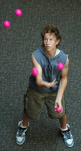 In 2017, Mathias set the world record for 10 ball lift bounce juggling, with a run of 51 catches.(video)